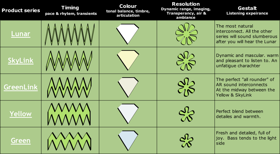* Sonic evaluations summarizes listening's tests with various of listeners. Those evaluations are subjective and represented as a key guide and not as objective measurements. (for this reason the ranking is graphical and not numerical). AR Sound keep the rights to make a small adjustments to the table from time to time, if you want to share your sound experience with the AR Sound cables, please Contact Us